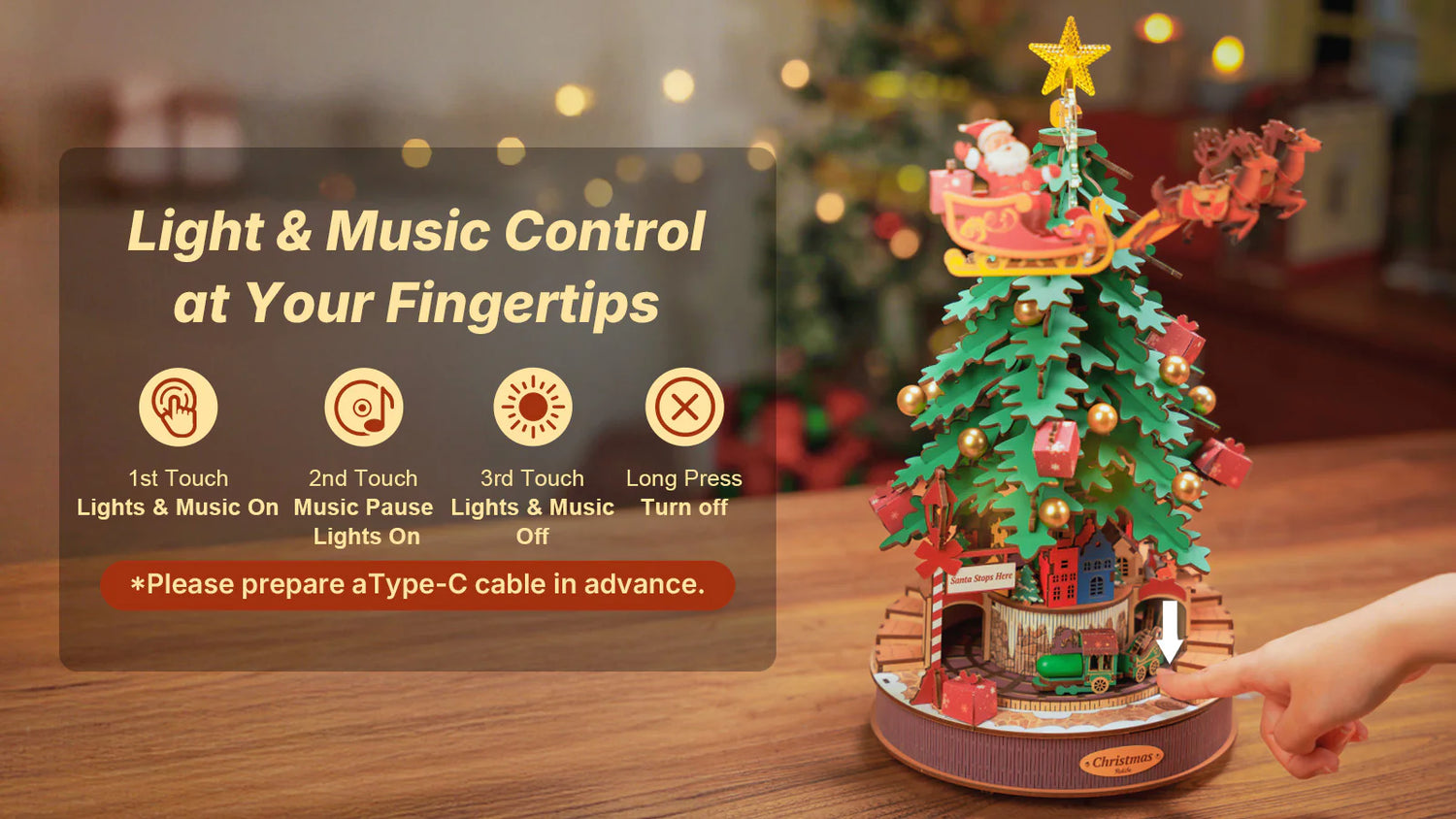 Am Fuße des Baumes befindet sich außerdem eine Spieluhr, die vier fröhliche Melodien spielt – darunter „Deck the Halls“ und „Jingle Bells“ –, was die Weihnachtsstimmung verstärkt, während sich der Baum dreht.
