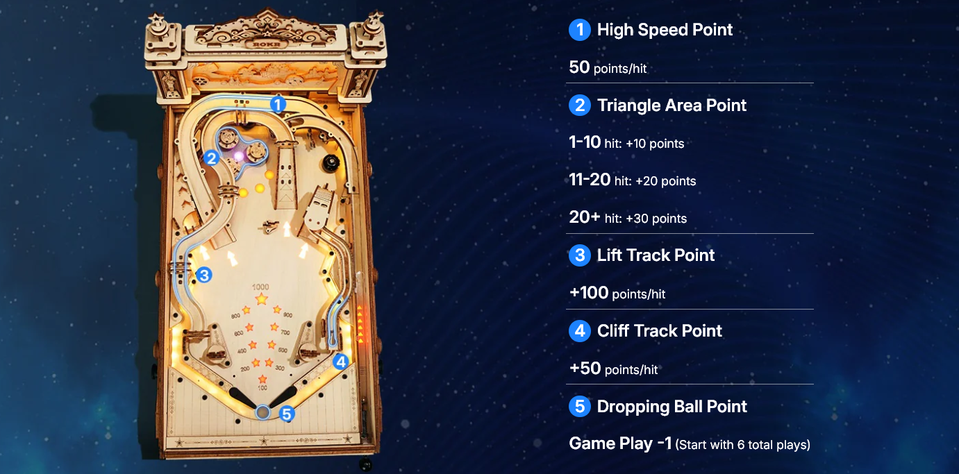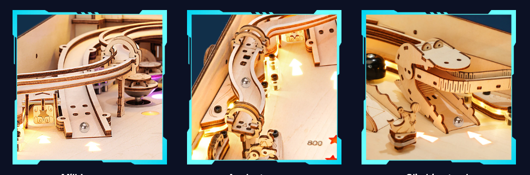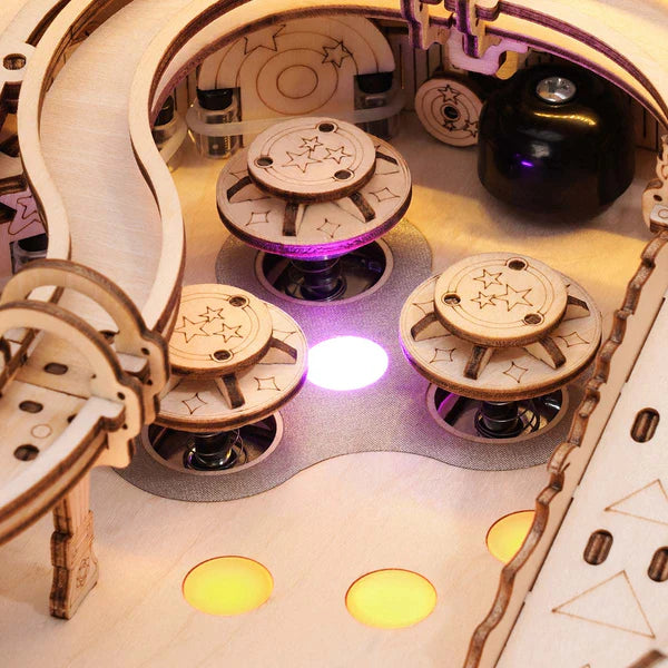 Stelle dich der Herausforderung und baue deinen eigenen Flipperautomaten! Mit einem vollwertigen Getriebe, beeindruckenden Licht- und Soundeffekten, elektronischer Punkteanzeige und weiteren coolen Designdetails bietet der ROKR Flipperautomat jede Menge Spielspaß – egal ob allein oder mit Familie und Freunden.
