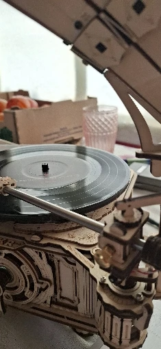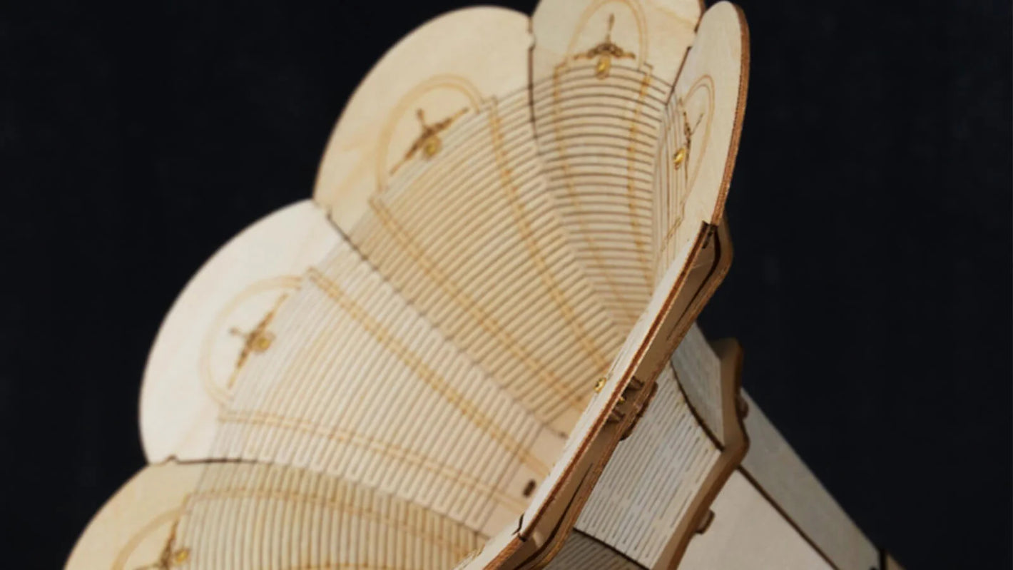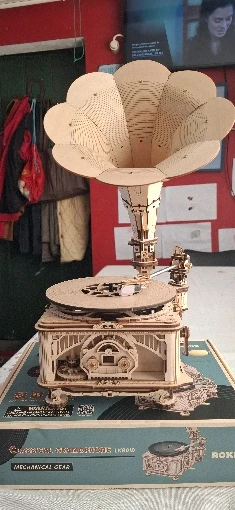 This wooden kit is a classic hand-cranked gramophone, inspired by the original model invented by Thomas Edison. It's designed in a retro style with a vintage turntable that not only looks beautiful, but can also play records.
